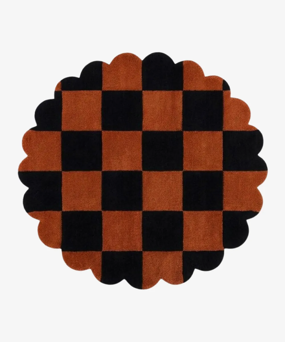 The Cinder Form rust rug is a bold piece that instantly draws attention. The deep, warm tones paired with a strong repeating pattern create a sense of rhythm that feels both grounded and expressive. Its round shape softens the intensity, while the unique wavy edges add a signature touch. This round carpet is designed to stand out without feeling overwhelming.