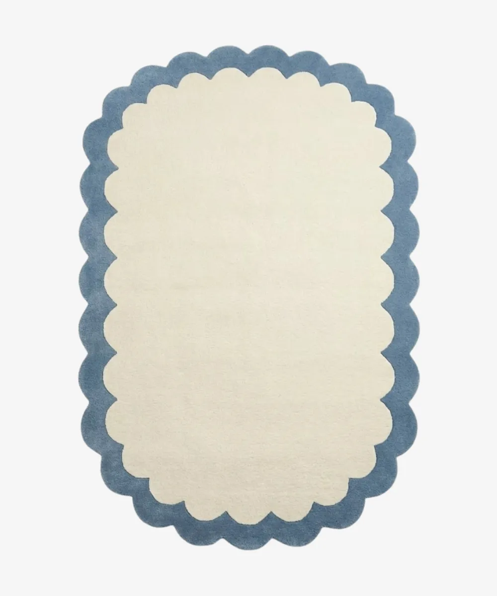 The Cloud Marina is a light, elegant rug defined by its ivory base and soft blue scalloped edging. The design feels airy and open, creating a sense of calm that brightens a room without drawing too much attention. Its gentle contrast and flowing shape make it ideal for interiors that prioritise lightness and visual clarity.