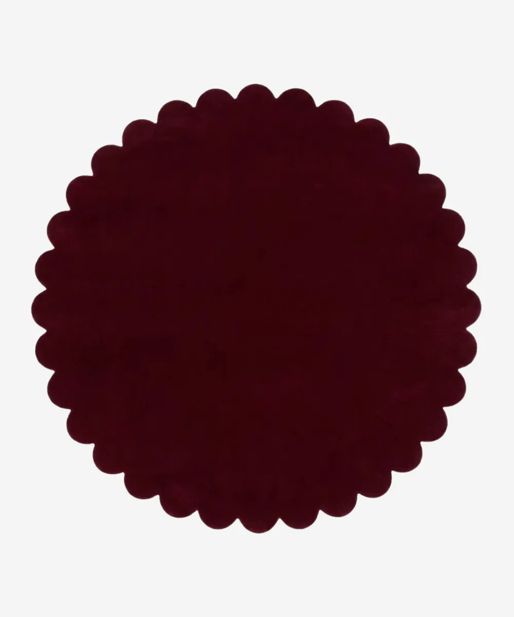 Crimson Aura round rug captures the elegance of deep wine tones and artistic curves. Its deep wine shade and scalloped round design add drama and sophistication to lounges, bedrooms, or prominent corners.