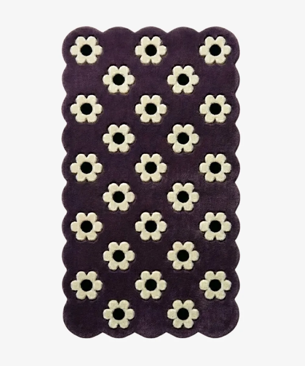 Bold and charming, Daisy Night features crisp daisy patterns spread across a dark, inky background. This creates a striking contrast that feels both playful and elegant. Inspired by night gardens and floral designs, this scalloped rug is hand-tufted from New Zealand wool and Viscose materials. It offers a thick pile, lasting durability, and a luxurious feel underfoot. The rounded edges soften the bold design and give it a refined look. This purple rug is perfect for bedrooms, lounges, or accent corners. It adds depth and character to darker or neutral spaces. Pair it with soft lighting, light furniture, or simple decor to make the pattern stand out. This designer floral rug works well in modern settings that value contrast, craftsmanship, and classic floral designs.