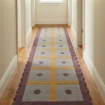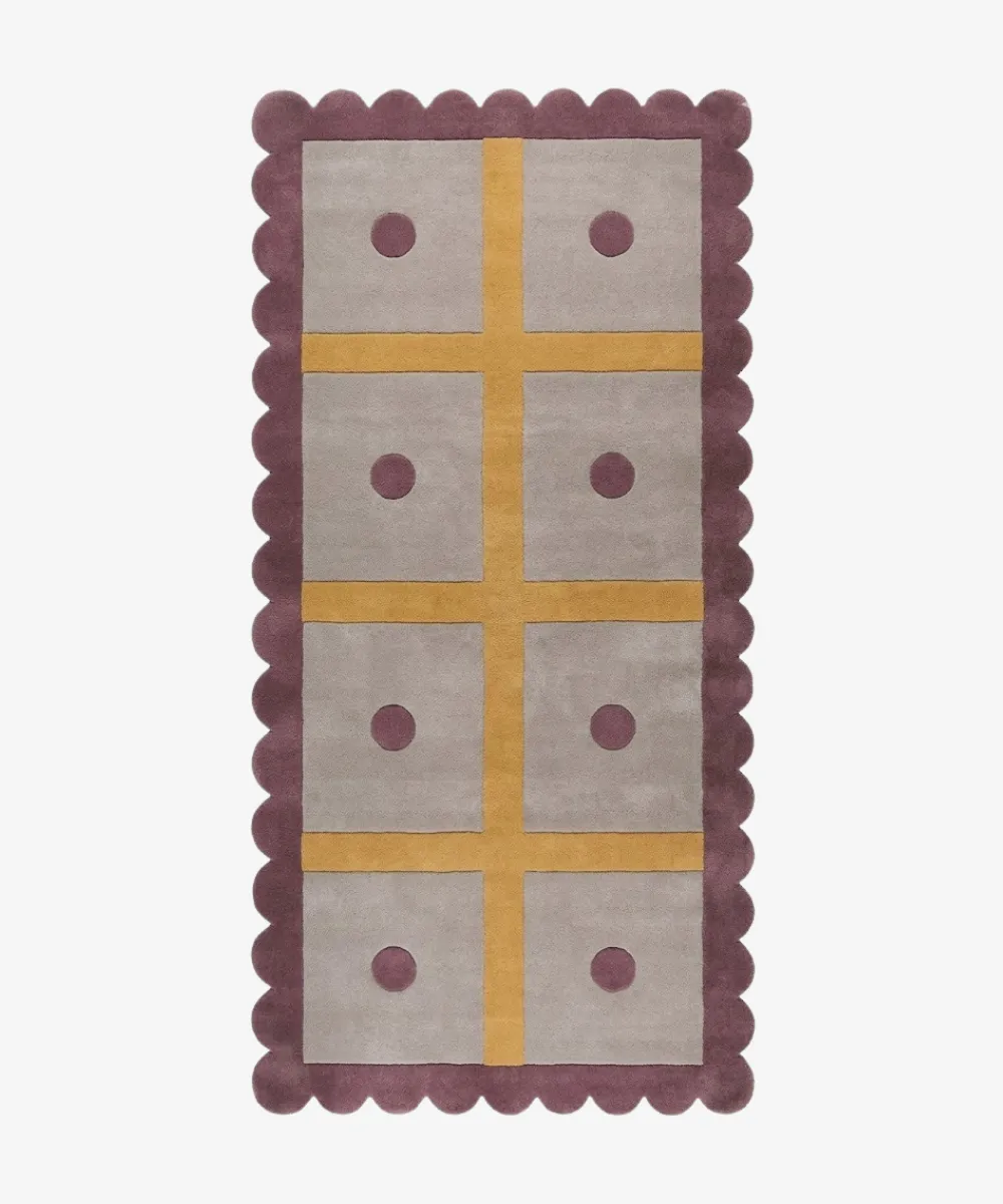 The Honey Lattice runner rug blends structure and charm through a distinctive geometric grid pattern with subtle circular designs. The modern rug features a soft neutral base framed by rich purple tones and intersected with warm honey-yellow lines that create a balanced visual rhythm. The scalloped edges soften the geometric structure, giving the design a welcoming and decorative feel. With its unique palette and structured layout, this rectangular rug brings character and warmth to interiors while still feeling elegant and modern.