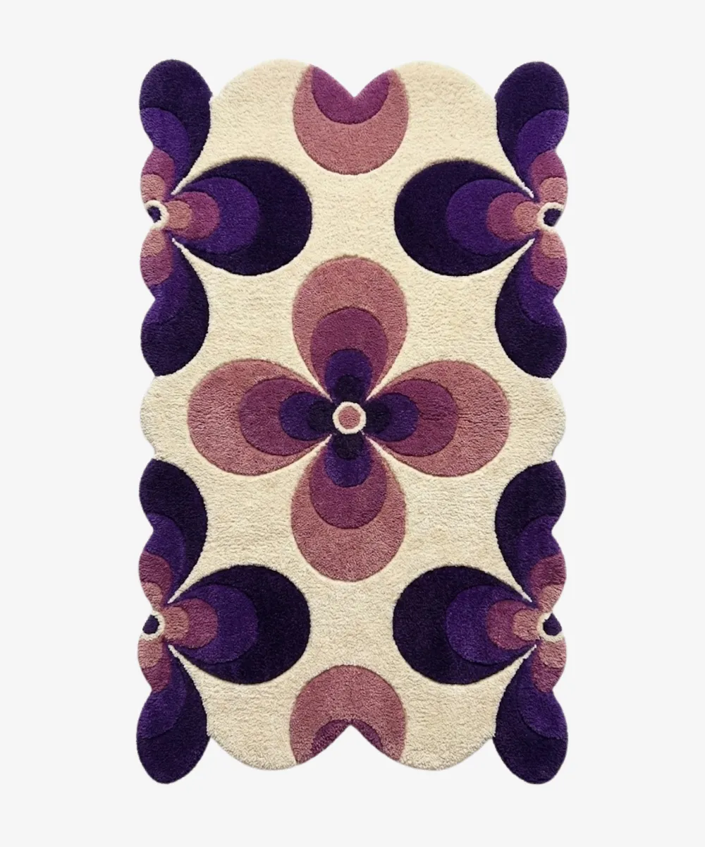 Dramatic yet graceful, Nocturne Bloom is inspired by flowers opening at dusk. It features layered petals in deep violet, mauve, and creamy ivory shades. The sculpted scalloped edges and bold floral pattern create a striking visual rhythm. Hand-tufted from high-quality wool, this floral area rug provides plush comfort, natural insulation, and lasting strength. It’s ideal for bedrooms, lounges, or elegant living spaces. It easily adds depth and mood to interiors. Style it with soft lighting, dark wood furniture, or metallic accents to enhance its evening-inspired colors. This designer purple rug is perfect for modern homes seeking a luxurious, scalloped rug that combines artistic design, rich colors, and handcrafted quality.