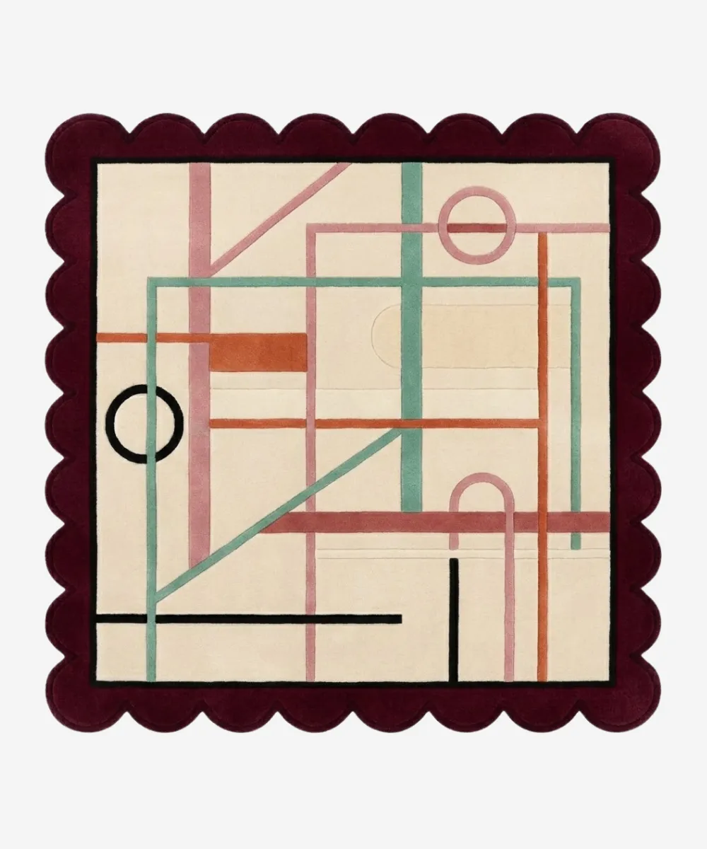 Hand-tufted from premium wool by skilled artisans, this ivory rug offers a plush, comfortable surface with a refined finish. The detailed line work and sculpted scalloped edges add dimension, giving the modern rug a crafted, design-forward presence. Its balanced palette makes it well suited as a living room rug, bedroom rug, or a statement piece for creative home offices and reading corners.
