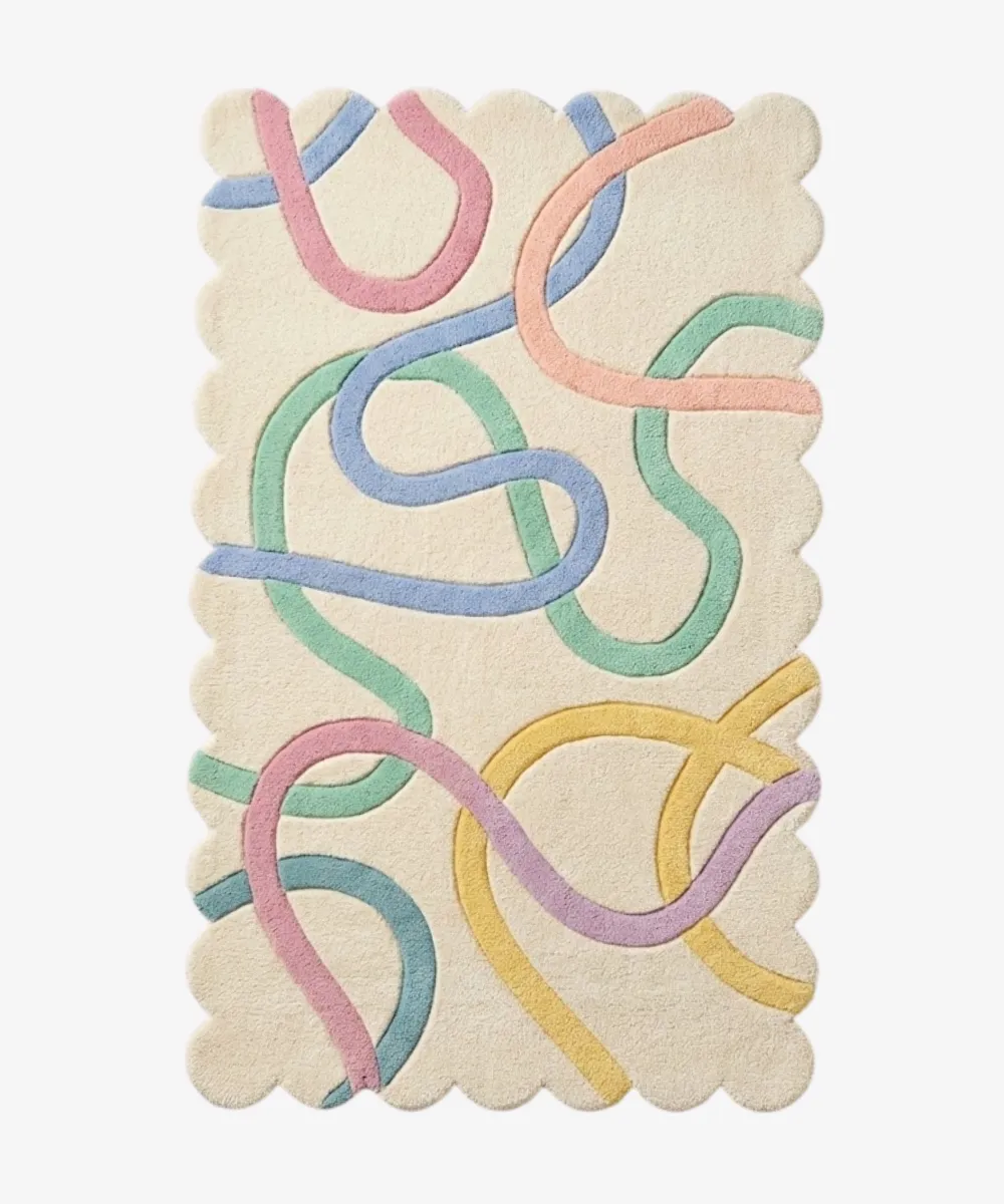 Sorbet Stream is a modern, scalloped area rug featuring flowing pastel lines that flow gently across an ivory base. The design feels calm, airy, and rhythmic. Perfect for relaxed, contemporary interiors.