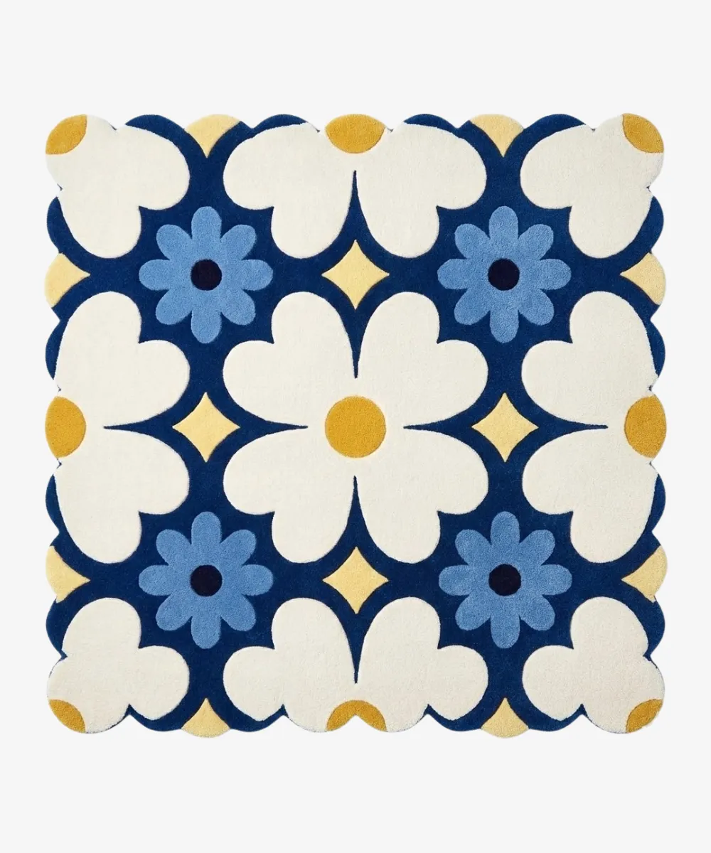Fresh, graphic, and uplifting, the Sun Dot Posy rug features bold floral shapes arranged in a rhythmic pattern of deep blue, soft ivory, and cheerful sun-yellow accents. Inspired by mid-century florals and tiled designs, the layout balances playfulness with structure. This makes it visually striking and timeless. Hand-tufted from premium wool, this scalloped floral rug offers a plush, cushioned feel. It also provides excellent durability and natural warmth for everyday living. The sculpted scalloped edges soften the geometric layout, adding texture and dimension. Ideal for living rooms, bedrooms, or creative workspaces, this premium white rug anchors the space without overwhelming it. Style it with clean-lined furniture, neutral upholstery, and subtle pops of color for a polished, modern look. Designed for contemporary homes, this floral area rug combines craftsmanship, comfort, and strong design.