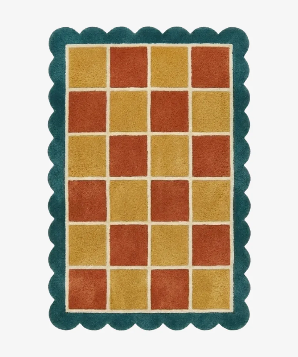 The Sunbathe Quilt is a light-filled rug designed to capture the feeling of sunlight resting gently across tiled floors. Its structured grid pattern is softened by warm golden and terracotta tones, creating a relaxed yet intentional visual rhythm. The scalloped border adds a subtle vintage touch, making it perfect for bright interiors, open spaces, and homes that embrace warmth without heaviness.