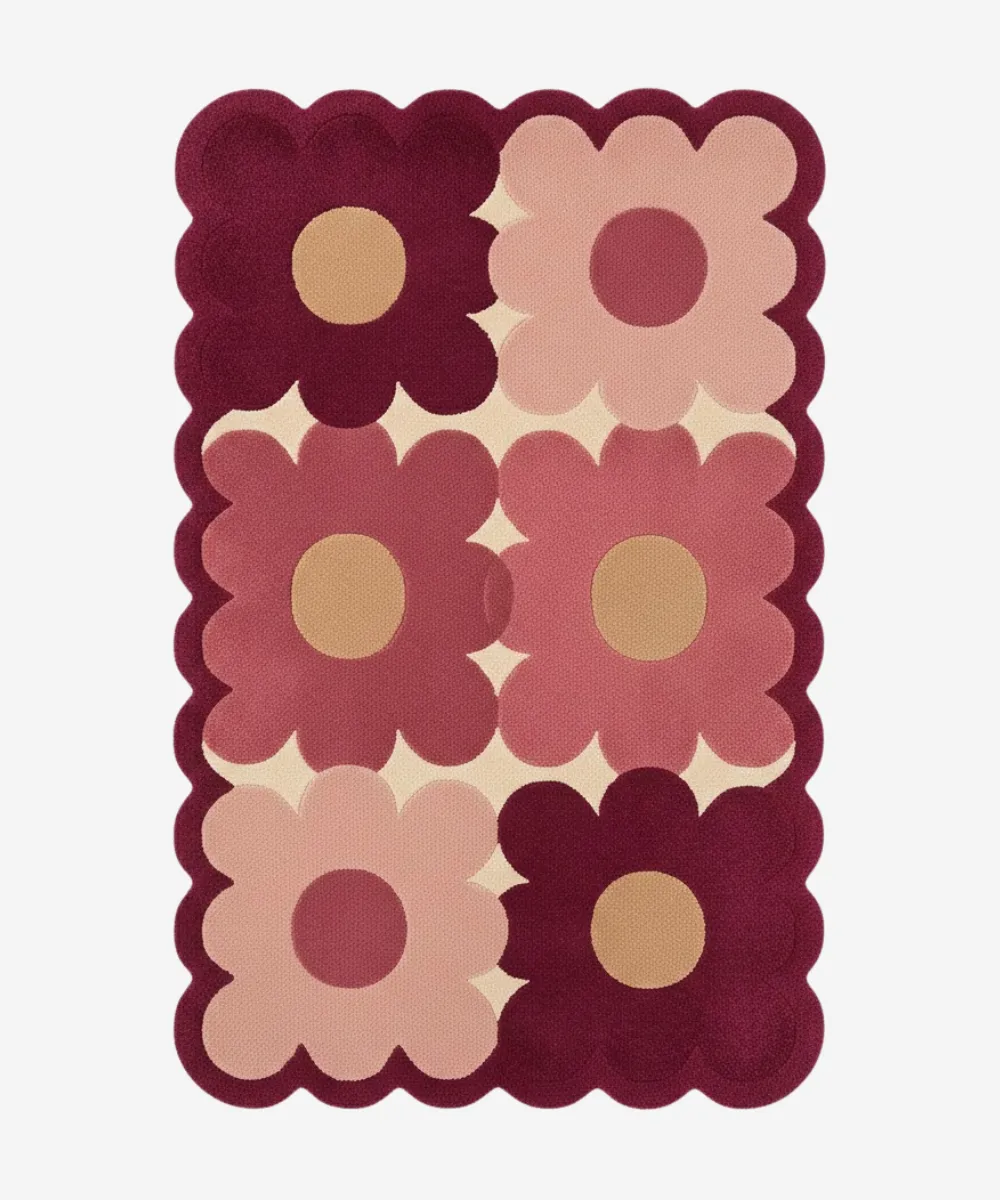 Handcrafted from high-quality wool by skilled artisans, this floral rug offers a soft, dense pile with unique curved edges that frame the design beautifully. The contrast between playful design and a smooth outline gives the rug its distinctive character.